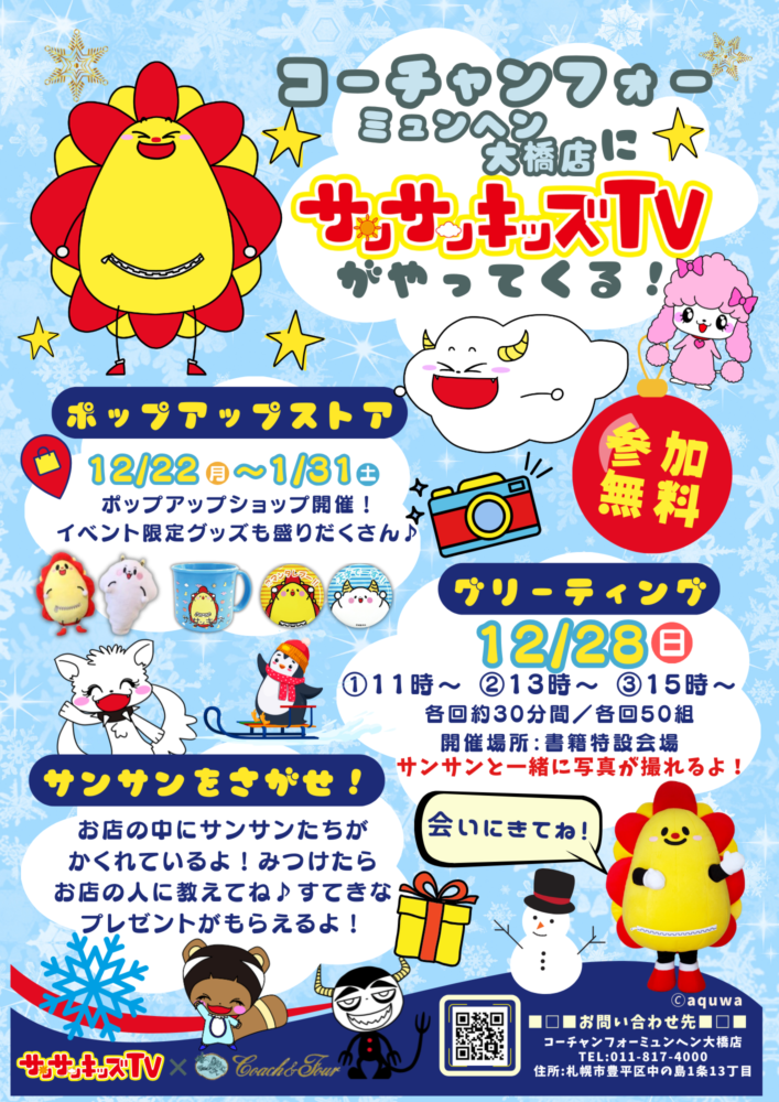 12/22(月)~1/31(土)の期間、新川通り店にてサンサンキッズTVのポップアップショップを開催致します!