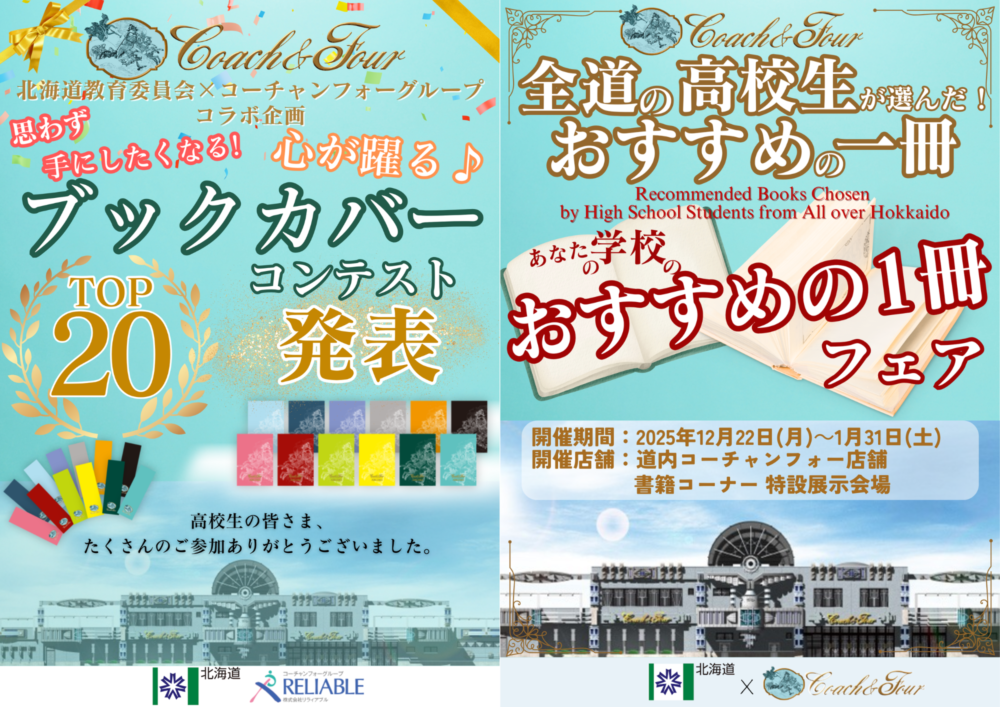 北海道教育委員会×コーチャンフォーグループ コラボ企画「オリジナルブックカバーコンテスト」優秀作品展示、「全道の高校生が選んだ!おすすめの1冊」フェア開催