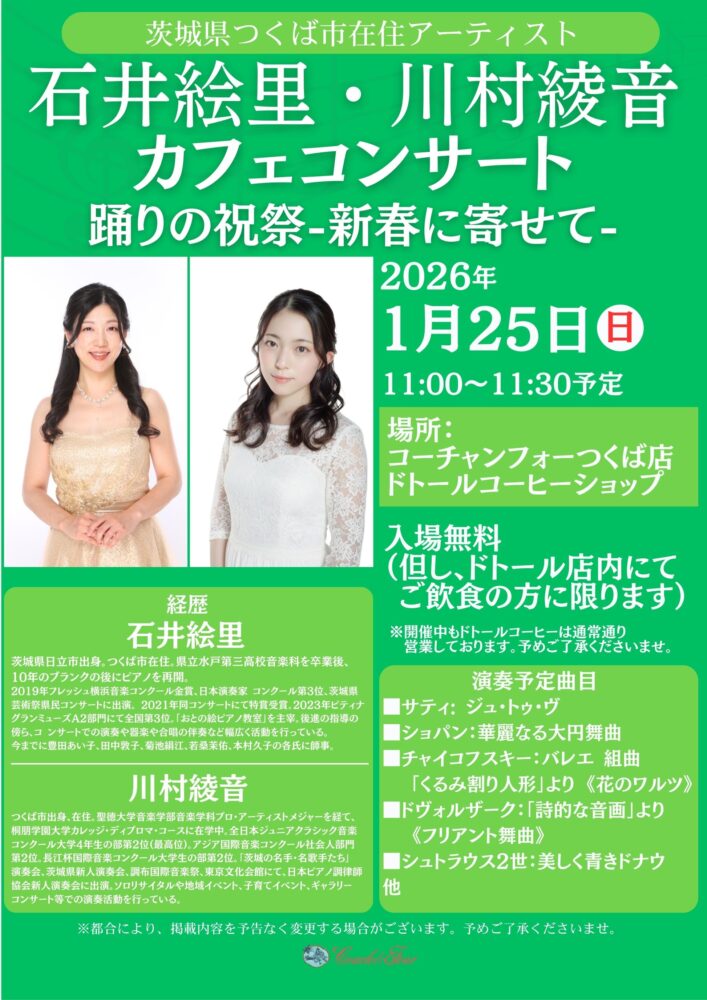 つくば市在住アーティスト、石井絵里さんと川村綾音さんによるカフェコンサートを1/25(日)11時からドトールコーヒーで開催いたします♪